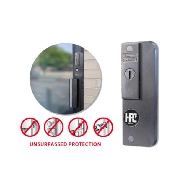 A common problem with narrow stile aluminum doors is an attack at the door jamb. An unprotected door is subject to a pry bar spreading the door and the jamb, or even ripping out the jamb, allowing unauthorized entry. Sawing the bolt has also been a means to gain unlawful entry. DorGard III™ will thwart all of these attempts, as well as guard the lock cylinder.