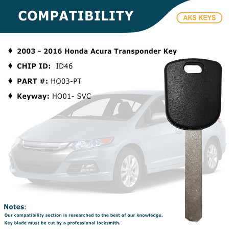 2003 - 2016 Honda Acura Transponder Key - ID46 Chip "V" - HO03-PT (25 Pack)