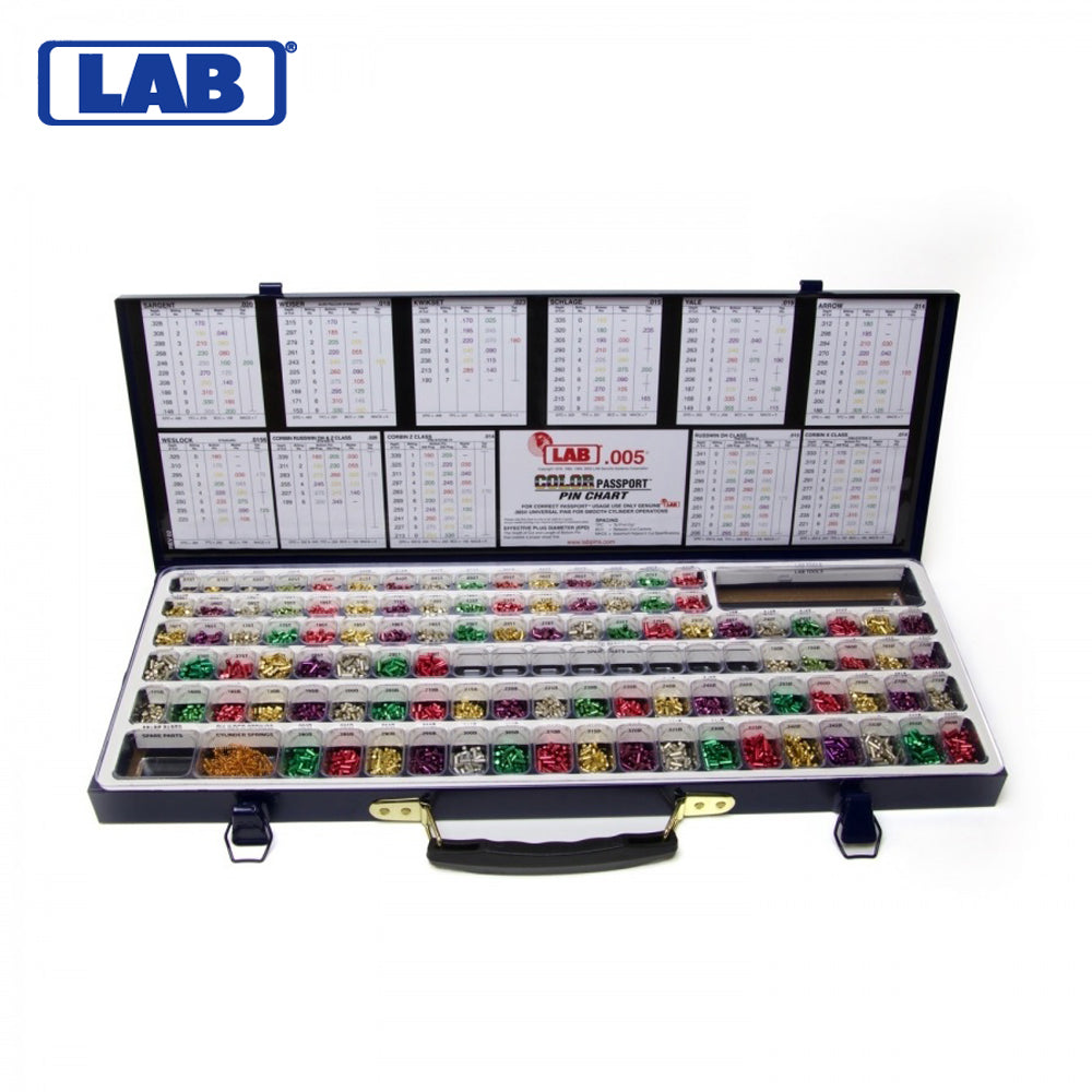 The LAB LPK005 Classic Pro .005 Universal Rekeying Pin Kit is a universal classic pro rekeying kit that comes with a smart, tough solid metal case complete with double latches and a center lid carrying handle. A seal-tight lid prevents the pins within from mixing with one another, while a dual-view pin tray shows enlarged pin sizes printed under a clear plastic tray both above and inside the pin pockets for easier viewing from any angle. These LPK005 pin kits feature the .005 Color Passport Pin Chart, where pin sizes are printed in the same color as the pin.